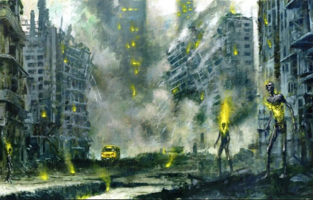 ‘Fleck saw that the swimming pigs’ heads had floated off the VT’s screen and were circling the waiting area near the ceiling, even though the commercial had ended and a game show had come back on. They no longer sang, but smiled anthropomorphically. One of the heads drifted down toward a jittery man too nervous to be seated Fleck guessed that he was overdosed on buttons or even purple vortex. The man’s eyes went wide and he scrambled backwards, bumping into people, turned to flee from the grinning head as it continued to follow him, swooping down very close. A gang kid clutching a scorched ray wound to his shoulder pushed at the addict angrily for bumping into him, and the man fell to the floor, yelping and babbling, “Meat! Meat! Meat!” as the disembodied head bobbed only inches from him. A nurse elbowed through the throng, and used a spray can to mist the man’s body. The spell was broken and the head rose like a released balloon. Another staff member pointed the VT’s remote and touched an ad-banishing button. All of the porcine holographic heads vanished.’